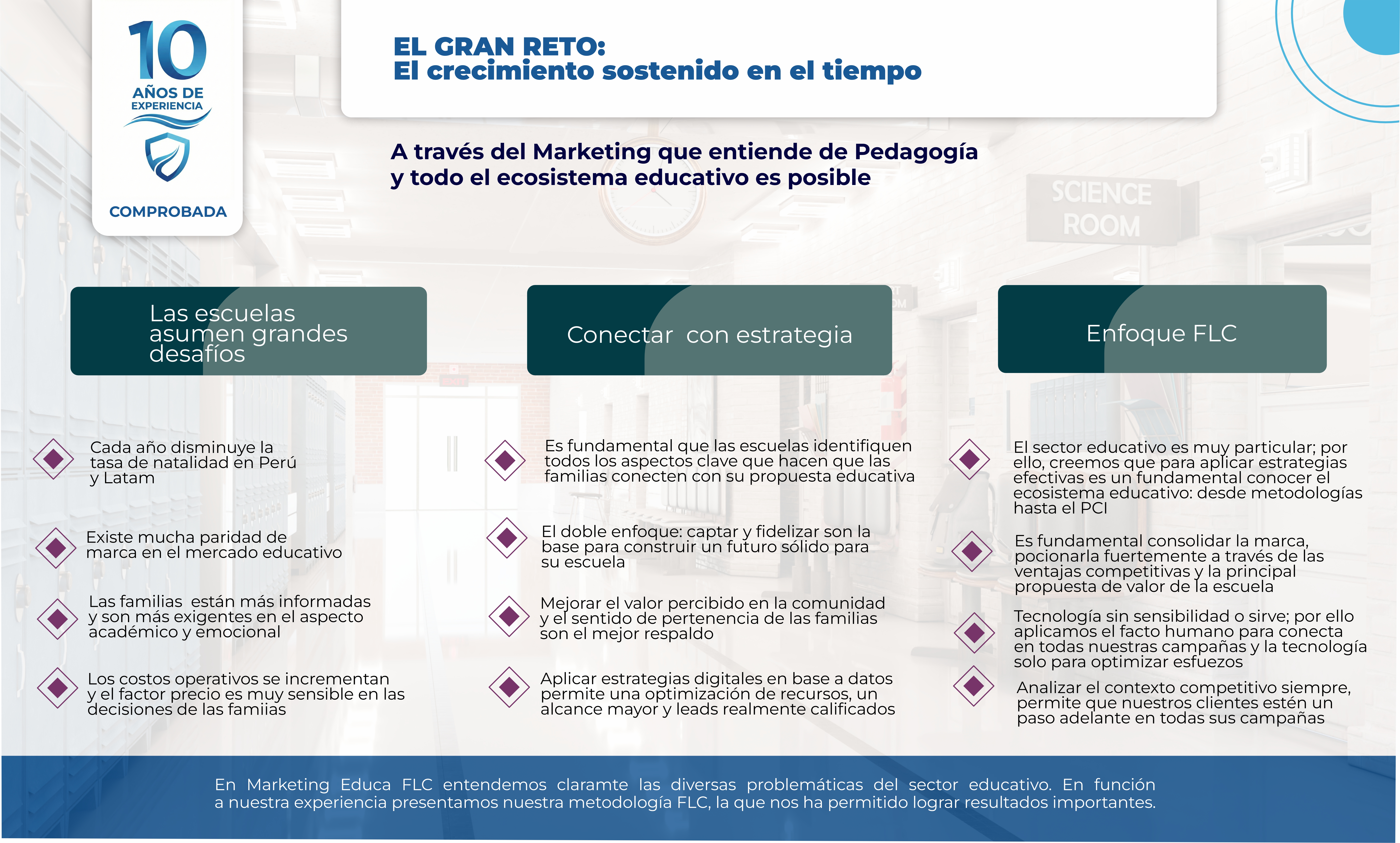 Integramos, de manera eficiente, las distintas estrategias y herramientas del marketing con diversos enfoques educativos y acompañamos a nuestros clientes hasta el logro de sus objetivos. No buscamos que nuestras ideas solo sean memorables, buscamos aterrizarlas en resultados concretos; para ello, contamos con un staff de administradores especialistas en procesos e implementación de indicadores.